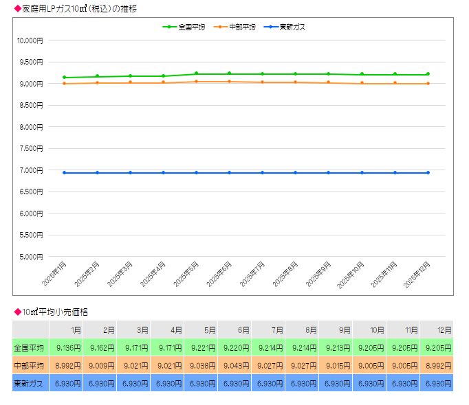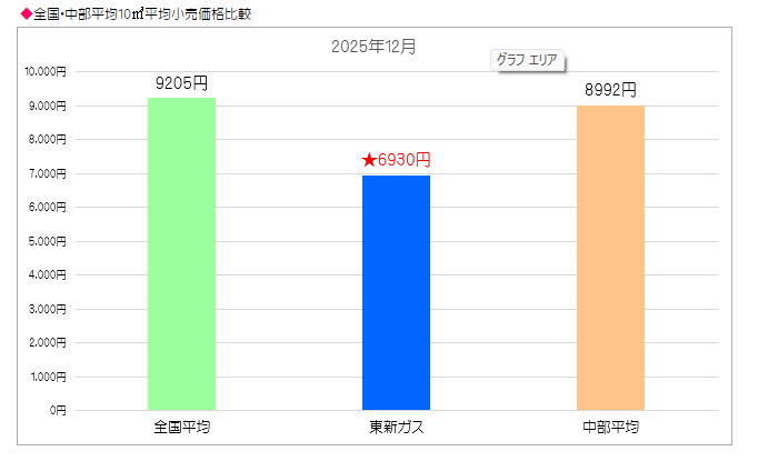 下比較表の全国平均及び中部平均は石油情報センター資料(11月28日)から、弊社のガス料金は全国平均値から24.7% 中部平均値から22.9%ほど安くなっております。