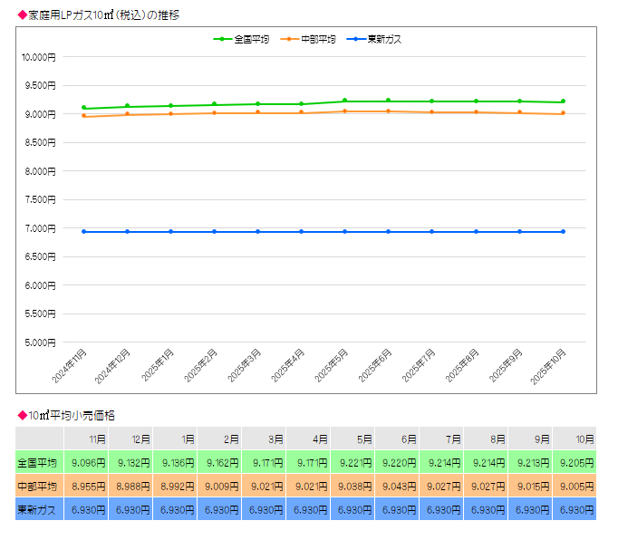 下比較表の全国平均及び中部平均は石油情報センター資料(8月29日)から、弊社のガス料金は全国平均値から24.7% 中部平均値から23.0%ほど安くなっております。